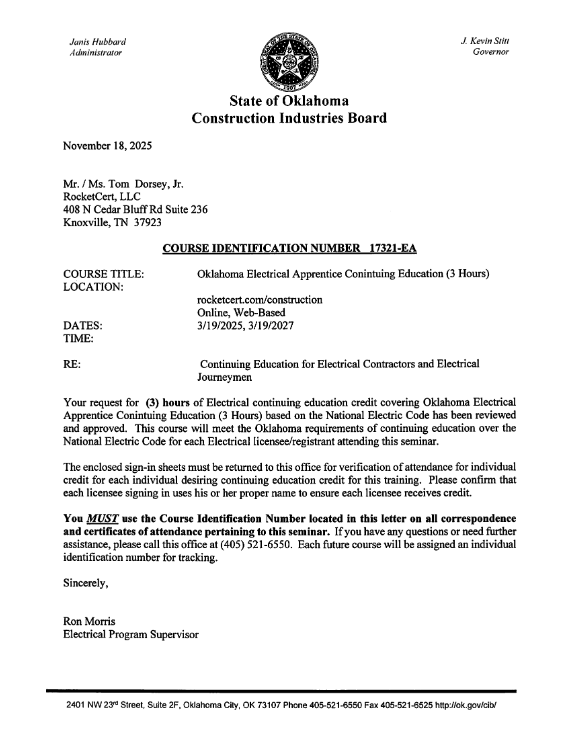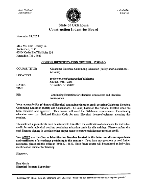 Licensed Oklahoma Electrical completing the required 6 hours of education online with RocketCert