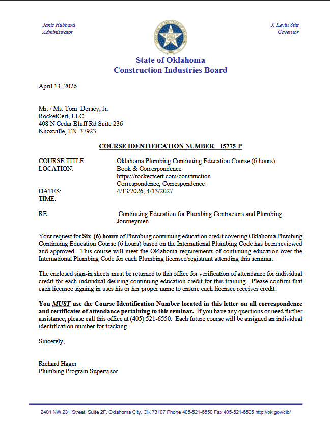 Oklahoma Plumbing Contractors are required to complete 6 hours of continuing education prior to each renewal. The state issues 3 year licenses, and the expiration is 3 years from the date it was issued. Our courses covers all of the required topics including Oklahoma codes, safety, and business topics. We hope that you will make RocketCert your home to complete your Oklahoma Plumbing Continuing Education.