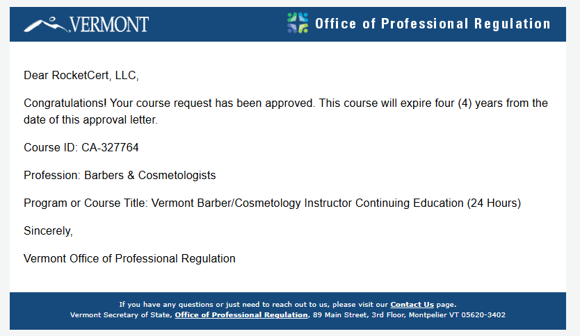 In Vermont, Cosmetology instructor licenses expire on November 30th of odd-numbered years. In order to renew, the state requires that you complete 24 hours of approved continuing education. The topics of the education are set by the board and must comply with their requirements.
