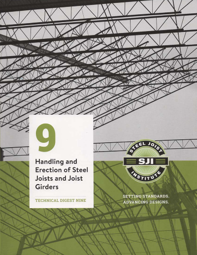 Technical Digest 9 provides comprehensive guidance on proper installation procedures to be employed in the field to ensure SJI products are not damaged, perform as specified and – most importantly – are erected safely. The digest includes descriptions of the standard products: K-Series joists, LH/DLH-Series joists, joist girders and CJ-Series joists. It details how joist products are prepared, tagged, loaded and shipped from the joist manufacturer’s plant; how they are to be unloaded and stored at the jobsite; and how the joist products are to be erected including bridging and field inspection. Additional topics include panelized erection and common field issues.