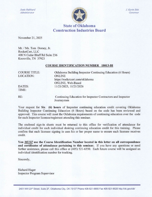 This course, Oklahoma Building Inspector Continuing Education - Online (6 Hours), has been approved by the State of Oklahoma Construction Industries Board for 6 hours of continuing education credit.