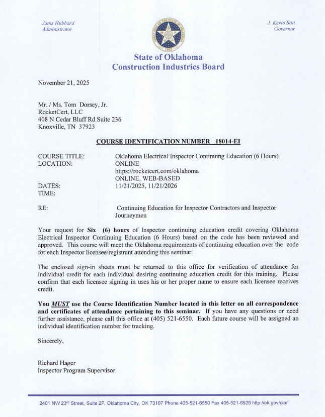 This course, Oklahoma Electrical Inspector Continuing Education - Online (6 Hours), has been approved by the State of Oklahoma Construction Industries Board for 6 hours of continuing education credit.