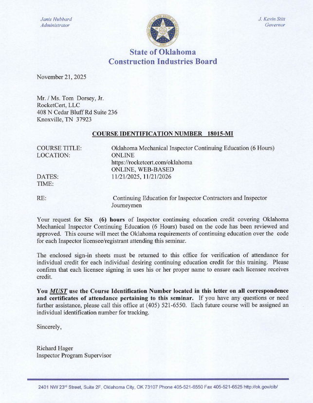 This course, Oklahoma Mechanical Inspector Continuing Education - Online (6 Hours), has been approved by the State of Oklahoma Construction Industries Board for 6 hours of continuing education credit.